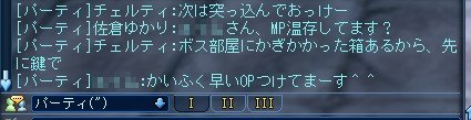 チェルさんと、その相方の3人からの募集で。前衛不足気味な昨今、支援前衛が揃った状態からの募集というのは割と楽な部類な気がします。で、乗ってきたのはWiz3名。「Wiz3だけど大丈夫?」と聞かれたのは、主に後衛支援に回る私の意味でしょうか。まあ、その時は大丈夫だと思ったんですよ。