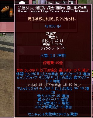 なかなか長い名前と効果です。一番下の一文は気にしないで下さい。これまで、魔法学校靴に対してエンチャント大失敗しなかった事がないので、さすがに使いました…。