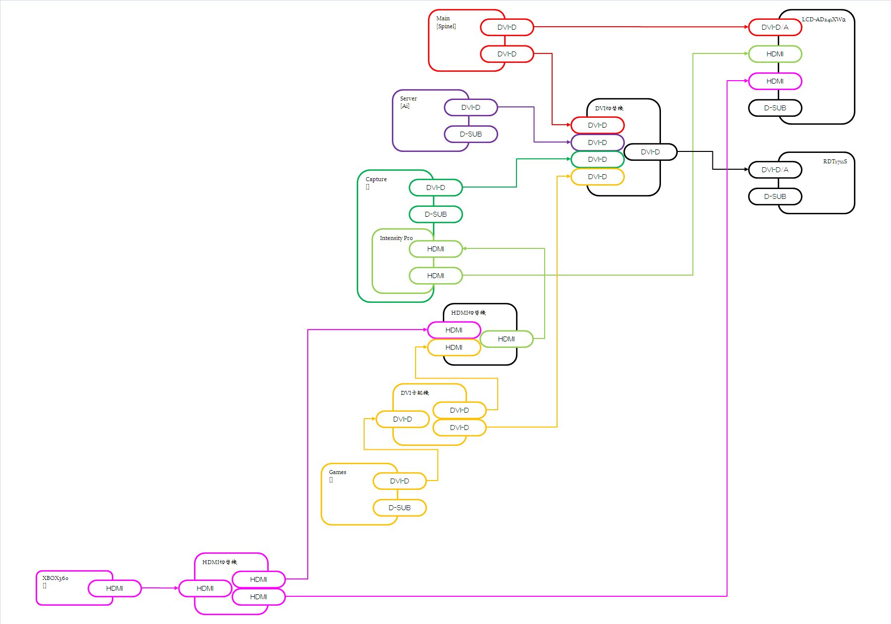メインPC(赤)、サーバ機(紫)、キャプチャ用PC(緑+薄緑)、ゲーム用PC(オレンジ)が現状の環境。これに、XBOX360(ピンク)が加わる事になります。具体的には、HDMI切替機2台と本体ですね。