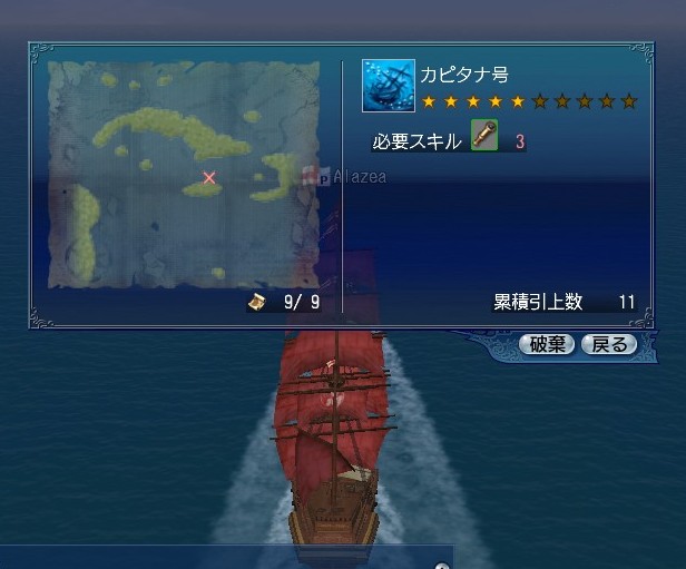 カピタナ号、発見物となる沈没船です。だんだんと地図の破片の必要枚数が増えていっているのできつくなってるのですが、採集ばかりしてると妙に集まるので結構楽しかったりします。が、視認や考古学は私は後ろのキャラにまかせっきりなので、単独では引き上げすら出来ない状況。港の近くであれば港前に浮かべて引き上げるのですが、遠い洋上となるとちょっとつらくなってきます。どうするっかなぁ…。