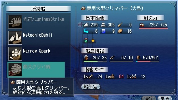速度・積載量共に最高を誇る名実共に最高の交易船、商用大型クリッパー。少々お値段は張りますが、かなり安く譲ってもらえて感謝です。もっとも、私の交易レベルはまだ50代でレベルキャップ解除すらしてない(できない)状態。乗れるのはまだまだ先になりそうです。