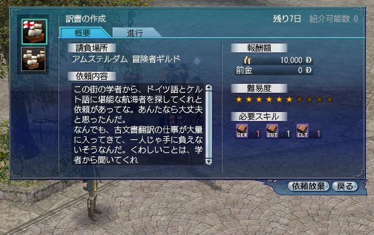 ついに、このクエストを出すことが出来ました。翻訳家になるための、前提クエストであります。単なる前提ではあるのですが、同時に希少クエスト(一度達成すると二度と出ない)なわけでして、他人から紹介してもらう事が望めないクエストだったんです。