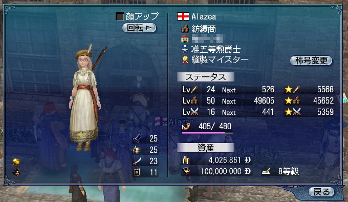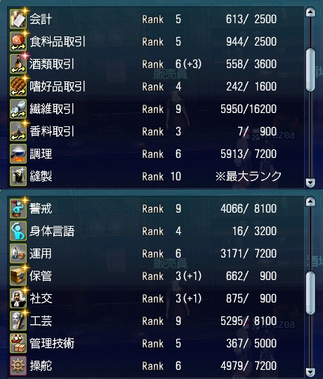 そうして、後ろの子の商大ガレオンも含めて満載したら、町に戻って修練です。が、大きな葉は保管R13のコチニールでしか使えないのでそのままでは修練になりません。そこで強欲商人の鉄鎖。一時的にランクを+5するという消耗品で、無理やり上げていきます。ごーりごーりと。
