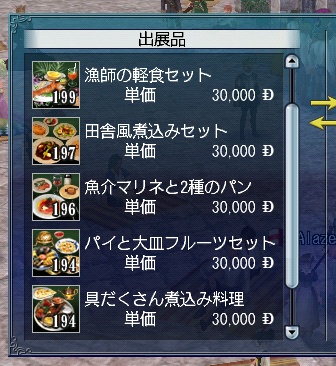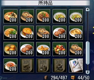 工芸上げしながら近海をうろうろしていたので、ついでに販売場所へ寄ってその都度購入。2ndである後ろの子が所持欄に余裕があったので、必要な料理をすべて200個買い集めちゃおうかな、と。重複しているものはメインでも持てば問題ナシでしょう。