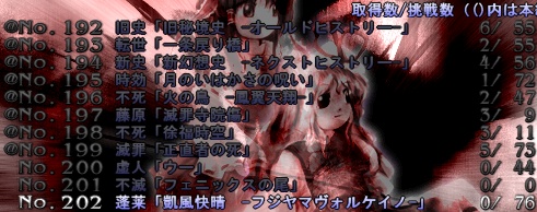 まったく関係ないけど、Extraの練習で疲れて魔理沙のEasyを埋めてたら妹紅さんからメッセの登録が来て、名前を見て一瞬びくっとしたのは此処だけの秘密です。きっと。