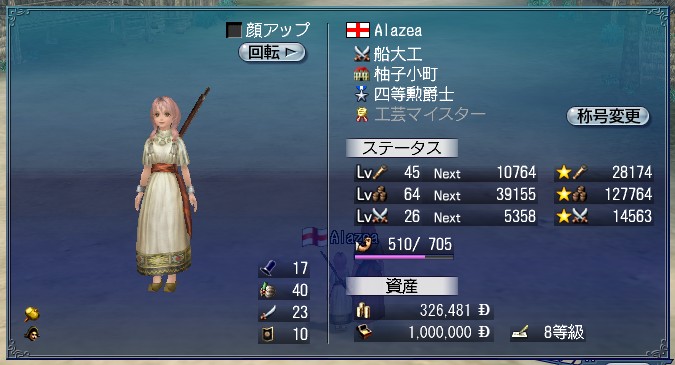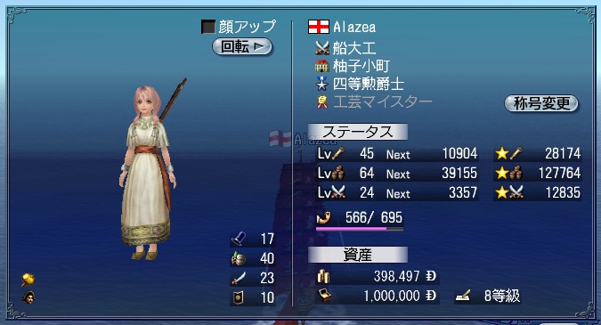 SSとか撮るの忘れたけど、1時間ほどで26→28に。銃士の転職可能レベルを満たしたので、今度手伝ってもらって転職状だけでも入手しておいたいな、と思ってます。以前から銃士だけは興味あったのよー。