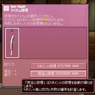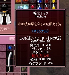 やっと出たのかー、と思ったのですが詳細見てびっくりの耐久5。耐久+4の1級ドロップ品ですね。まあ幅広自体が一打硬直ボーナス?がなくなったので使う事はないと思うのですが…。