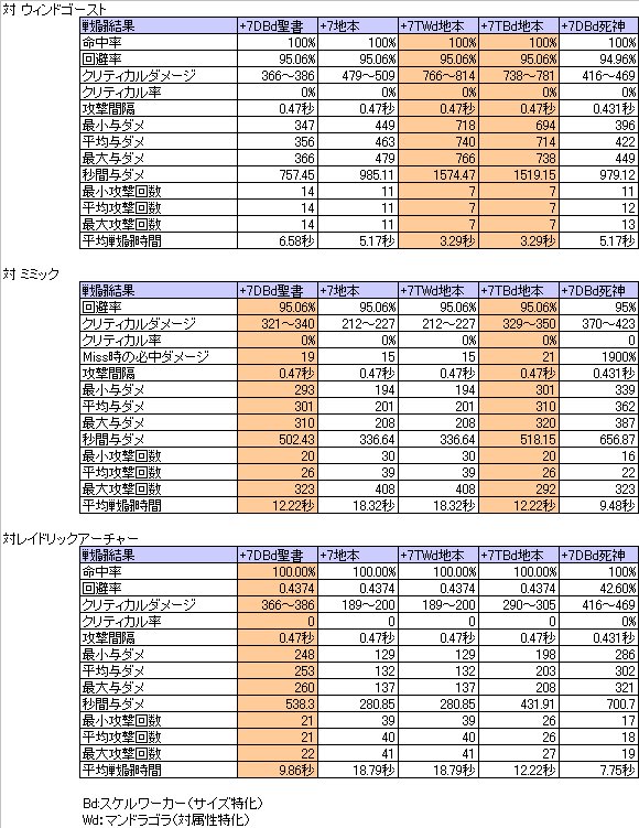 下の方に、一緒に出てくるmobも対象にしてみました。相変わらずDBd聖書の空気を読まない強さに惚れます。ミミック相手にTBd土本と同成績となったのは、命中率とサイズ特化に付随してくるボーナス(Atk+5)の違いでしょうね。
